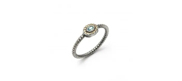 Anillo con muchos detalles y una piedra semipreciosa ovalada con orla de circonitas de 7x8mm en el centro.