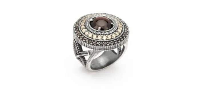 Anillo de plata. Engastado con piedras semipreciosas. Piedra central granate redondo 10mm y orla circonitas cava, brown. Diametro 23mm y ancho brazo 7mm.