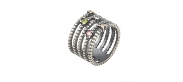 Anillo de plata de ley 925 y circonitas en distintos colores en talla brillante. Una combinación con carácter es la que tiene este anillo de 5 tiras de plata envejecida acabado a mano, coronadas con circonitas en tonos verde peridoto y brown de 3 mm que siempre son un acierto, y tres circonitas más pequeñas, de 2 mm , dos en cava y una blanca que aportan luminosidad a la combinación.