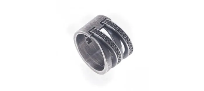 Anillo de plata envejecida de primera ley (925) que lleva engastados 36 diamantes negros de 1,5 mm con un peso aproximado de 0,60 Quilates.