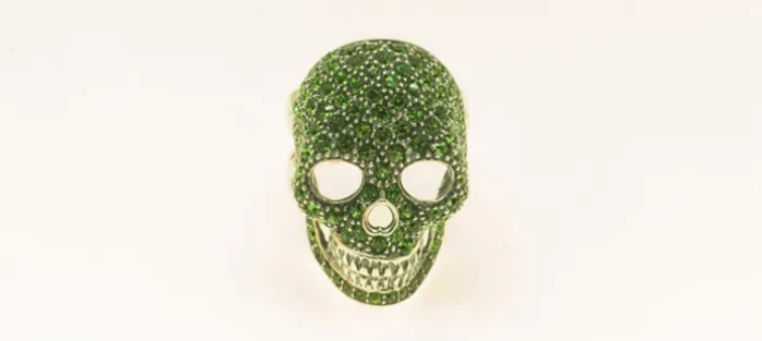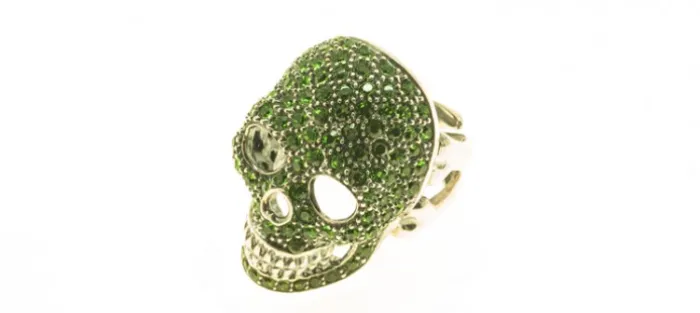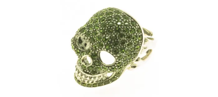 Anillo en forma de calavera en plata de primera ley (925). Con cristales Swaroski verdes.