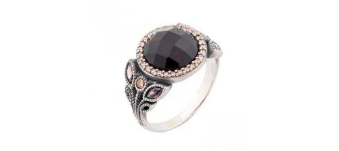 Anillo de plata envejecida de primera ley (925) con un Granate y Zirconitas.