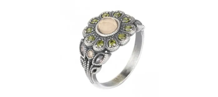 Anillo de plata envejecida de primera ley (925) con un Cuarzo rosa y Zirconitas.