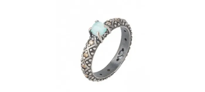 Anillo de plata envejecida, con brazo de 0,5 cm de ancho, circonitas de color champagne y un cabujón cushion liso de calcedonia de 4 mm por 4 mm.