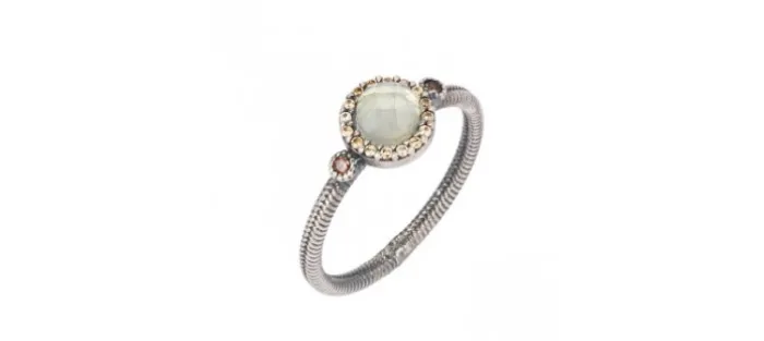 Anillo de plata envejecida con un cabujón facetado de calcedonia y circonitas color cava.