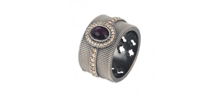 Anillo de plata envejecida, brazo de 14 mm con un cabujón facetado central de turmalina rosa oval de 7×5 mm y circonitas champangne talla brillante.