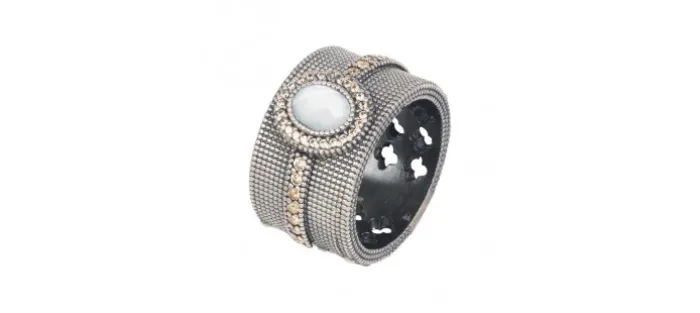 Anillo de plata envejecida, brazo de 14 mm con un cabujón facetado central de calcedonia oval de 7×5 mm y circonitas champangne talla brillante.