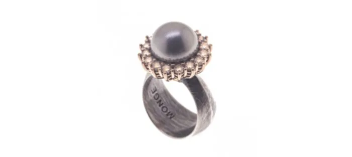 Espectacular anillo de oro rosa de primera ley (750), plata envejecida (925), perla Tahit de 13mm y 16 diamantes color coñac de 3mm con un peso aproximado de 1,85 Cts.