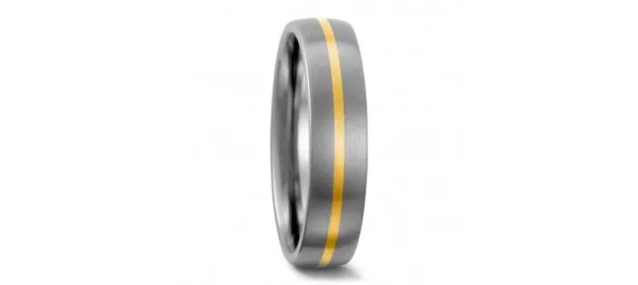 Anillo de Oro de 18 Kilates y Titanio con una anchura de 5 mm, superficie mate curvo tanto interior como exterior. Hecho en Alemania.