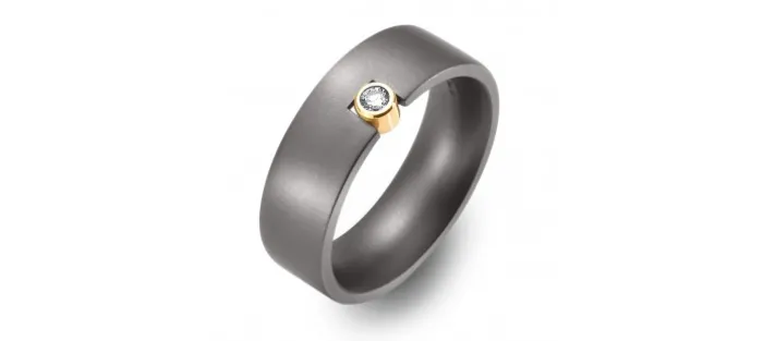 Anillo de Titanio y Oro con una anchura de 6,5 mm, 1 brillantes de 0,05 cts. y superficie mate tanto interior como exterior. Hecho en Alemania.
