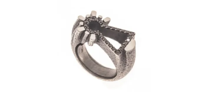 Anillo de plata envejecida de primera ley (925) que lleva engastados 26 diamantes negros con un peso aproximado de 0,71 Quilates.