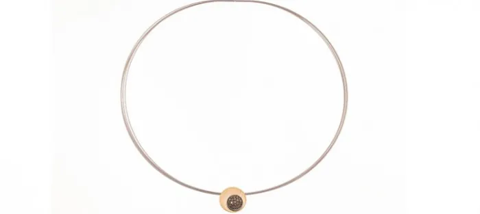 Colgante de plata envejecida de primera ley (925) y oro amarillo de 18 Quilates. En la parte superior lleva engastados 21 diamantes coñac de 1,4mm y con un peso aproxiamdo de 0,33 Quilates. Sirga de acero de 42 ó 45 cm.