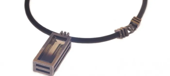Colagnte de plata envejecida de primera ley (925), oro de 24 Q, Cuarzo bicolor y caucho. Medida del colgante 6 cm. Medida del cucho 47 cm.