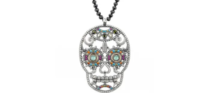 Este colgante te transportará directamente a la cultura mexicana por su originalidad, sus detalles y sus colores. Una cadena de ónix grande de la que cuelga una calavera XL repleta de detalles de plata y bronce y con piedras semipreciosas y circonitas que le dan un toque único. Escoge tu favorito.
