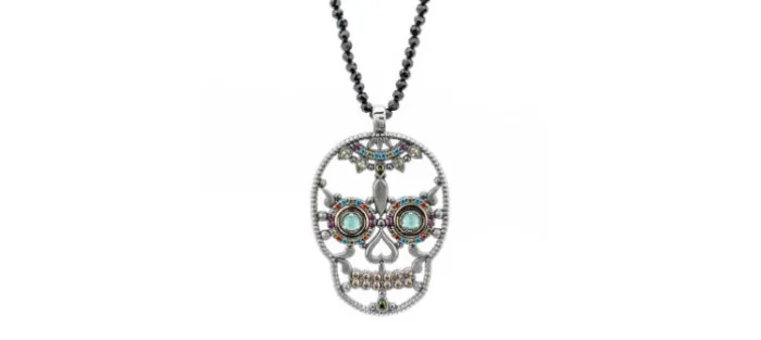 Este colgante te transportará directamente a la cultura mexicana por su originalidad, sus detalles y sus colores. Una cadena de ónix pequeño de la que cuelga una calavera repleta de detalles de plata y bronce y con piedras semipreciosas y circonitas que le dan un toque único. Escoge tu favorito.