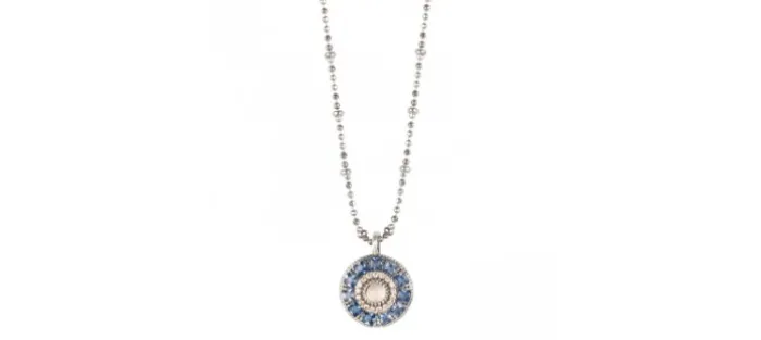 Colgante de plata de ley 925 rodeado de circonitas de un color azul intenso en talla princesa en 2×2 mm, un dulce corazón de cuarzo rosa de 3 mm acabado en plata envejecida y un círculo de circonitas en color cava de 1 mm. en talla brillante.