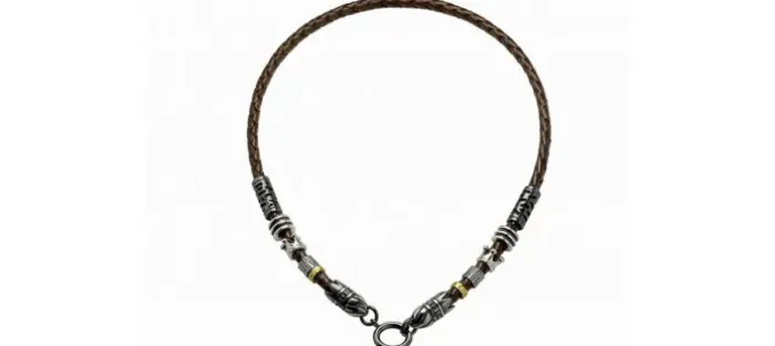 Colgante de cuero, oro amarillo de primera ley (750/1000) y plata de primera ley (925).