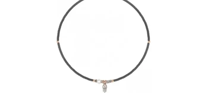 Completan el colgante hematites grises sobre hilo de acero negro.