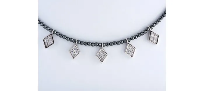 Gargantilla de plata de primera ley (925) con baño de rodio con circonita blanca y hematites facetado.