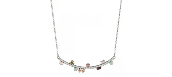 Colgante de plata de ley 925 y circonitas blancas. Destacan una baguette en sutiles tonalidades miel y una circonita en talla oval rosada, acompañadas de una marquise brown y cabujones mini calcedonia, cuarzo rosa y turmalina rosa. Completan el conjunto una circonita talla trillion en verde peridoto que aporta una nota de color y equilibrio. Cadena tipo roló de 42 cm de largo.