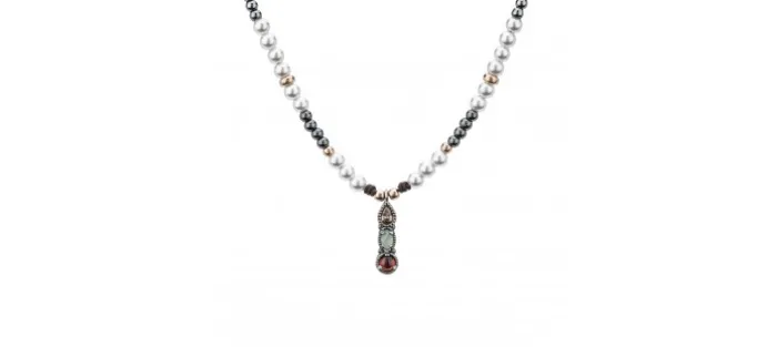 Colgante de macramé con bolas de plata de 3mm bañadas en oro rosa, perlas y hematites del que cuelga pieza central con tres piedras semipreciosas.