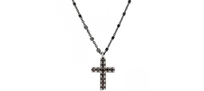 Colgante cruz de plata. Engastado con piedras semipreciosas. Piedra central circonitas brown. Medida colgante 14 10cm. Cadena lapidada rutenio largo a 40cm.
