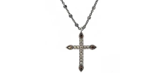 Colgante cruz mediana de plata. Engastado con piedras semipreciosas. Piedra central circonitas cava brown. Medida colgante 25 18mm. Cadena lapidada rutenio largo 45cm. Diseño elaborado en España 100% artesanal.