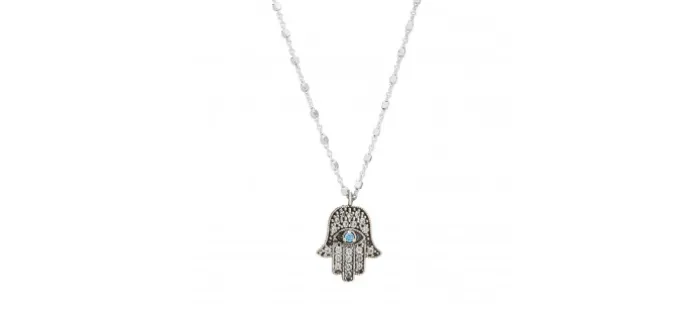 Cadena de plata de la que cuelga una mano de Fátima repleta de piedras semipreciosas, circonitas y detalles con una piedra semipreciosa en el centro.