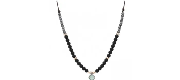 Colgante macramé de plata. Engastado con piedras semipreciosas. Piedra central calcedonia verde. Obsidiana, hematites. Extensible de 36 a 52 cm.
