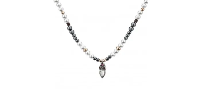 Colgante de macramé con bolas de plata de bañadas en oro rosa, perlas y hematites del que cuelga pieza central con piedras semipreciosas.
