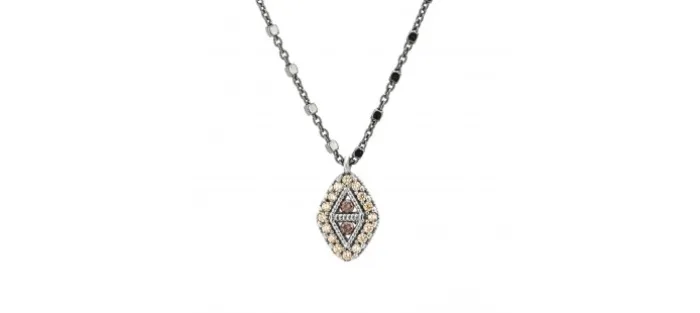Colgante con forma de rombo y cadena de plata con baño de rutenio de la que cuelgan dos circonitas en forma de triángulo con orla de circonitas.