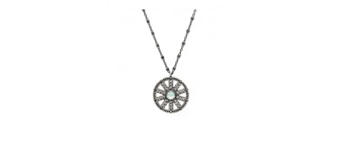 Colgante de plata. Engastado con piedras semipreciosas. Piedra central calcedonia, orla circonita cava y brown. Diámetro colgante 20mm. Cadena de plata con baño de rutenio largo 45cm.