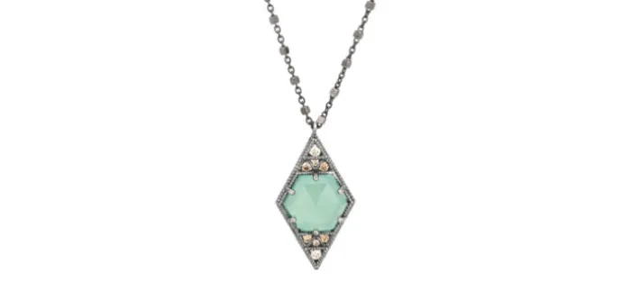 Cadena de plata con baño de rutenio de la que cuelga una piedra semipreciosa hexagonal de 20mm rodeada por pequeñas circonitas que le dan ese toque de luz único.