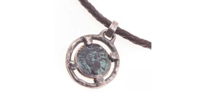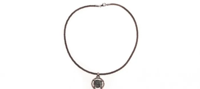 Colgante de plata envejecida de primera ley (925) con replica de moneda en bronce patinado. Cordon de cuero trenzado marrón.