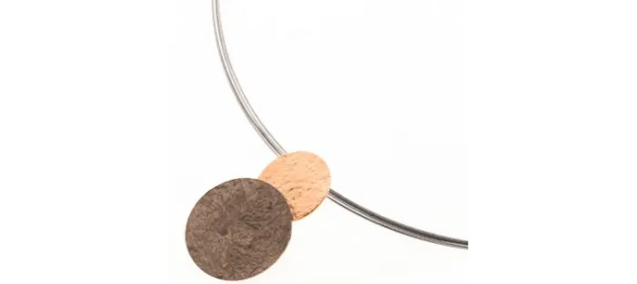 Colgante de plata envejecida de primera ley (925) y oro amarillo texturado mate de 18 Quilates. Sirga de acero de 42 ó 45 cm.