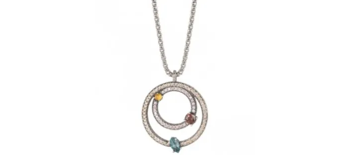 Colgante de plata de ley 925 y circonitas en tonos rosa y miel. Destaca el cabujón citrino acompañado de una marquise en color turquesa, protagonista de la colección Silence Speaks de Sunfield, junto con una característica circonita brown de 5mm en talla brillante que le dan personalidad a una pieza tan sencilla como espectacular. Se presenta con una cadena tipo coreana blanca de 2,5 mm y 80 cm de longitud.