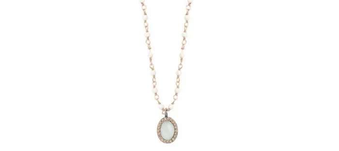 Colgante en plata de primera ley envejecida (925) con una Calcedonia y Zirconita coñac. Cadena tipo Rosario en plata de primera ley (925) con baño de color rosa.