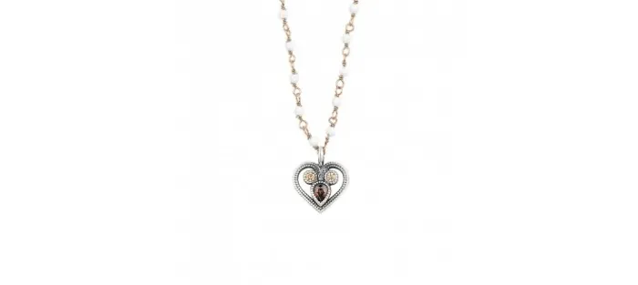 Colgante de plata envejecida de primera ley (925) y Zirconitas. El rosario de ágata blanca y plata con baño de oro rosa de 18 K, mide 42 cm de largo y las bolitas 2 mm de diámetro.