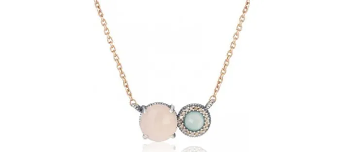 Colgante de plata envejecida de 19×9 mm con un cabujón facetado de 10 mm de cuarzo rosa y otro cabujón facetado de 5 mm de calcedonia rodeado de circonitas champangne. Cadena de plata bañada en oro rosa 18 k. de 21 cm de largo.
