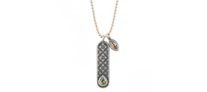 Colgante SUNFIELD con pieza central de plata envejecida y circonitas, de 2,5 cm por 0,7 cm. La cadena de plata con baño de oro rosa de 18 kt, mide 45 cm de largo y 1,5 mm de diámetro.