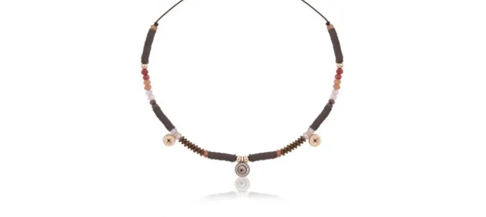 Colgantes con piezas principales tiene un colgante central de plata de ley 925 con circonitas brown y champagne talla brillante y dos colgantes de plata bañada en oro rosa de 18 k con circonita brown talla brillante. El resto del collar está compuesto por discos de caucho, hematites y cuentas de cristal, está montado con hilo de nailon marrón y la medida se puede ajustar según necesidad.