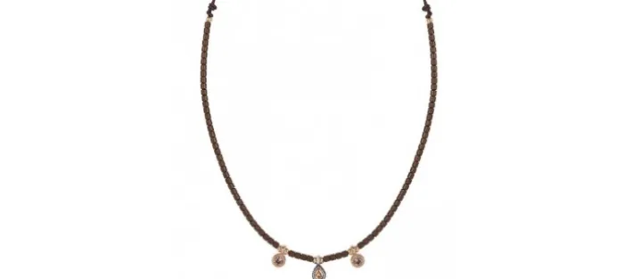 Colgante de plata, circonitas, hematites y nailon marrón, con tres piezas centrales de 3 mm por 2 mm de citrino y cuarzo fumé. Longitud ajustable entre 35 cm y 62 cm.