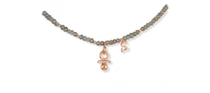 Gargantilla de plata de primera ley (925) chapada en oro rosa de 18kt con circonita blanca y labradorita facetada. Largo 40 cm.