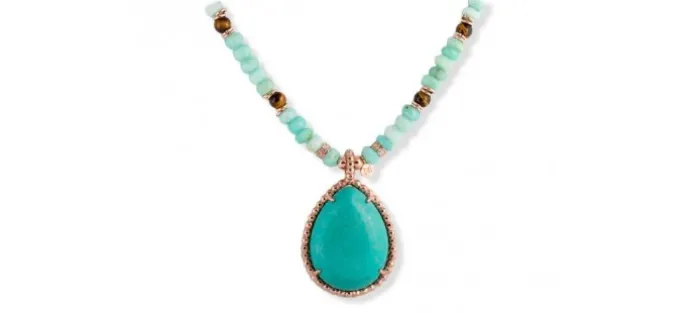 Collar de plata de primera ley (925) chapada en oro rosa de 18kt, ojo de tigre, ópalo azul y howlita. Largo 85 cm.