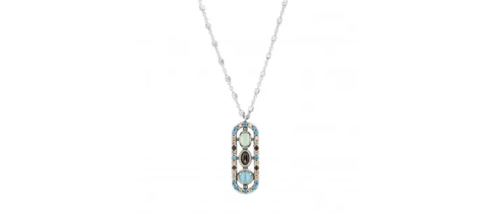 Cadena de plata de la que cuelgan tres piedras semipreciosas rodeadas de una orla de circonitas de colores.