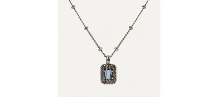 Colgante de plata de ley con acabado envejecido. Tiene una circonita central en azul aguamarina talla esmeralda rodeada de circonitas color cava talla brillante. Se presenta con con una cadena de bolitas de plata bañadas blanca de 42 cm de largo.