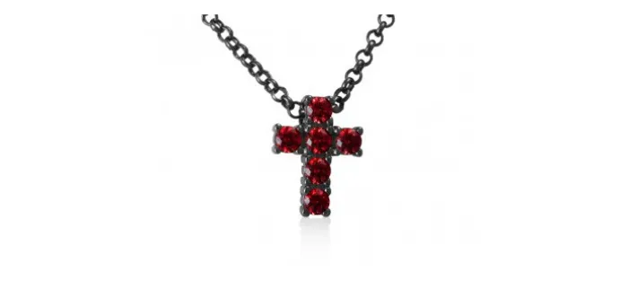 Cruz de plata de primera ley (925) con baño de rutenio y zirconitas rojas. (Cadena no incluida)