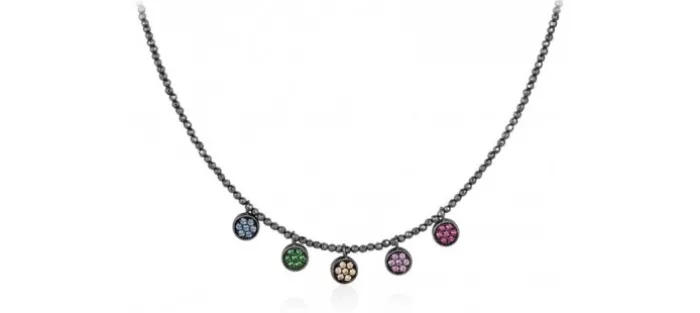 Gargantilla de plata de primera ley (925) con baño de rutenio con hematites facetados y circonitas de colores.