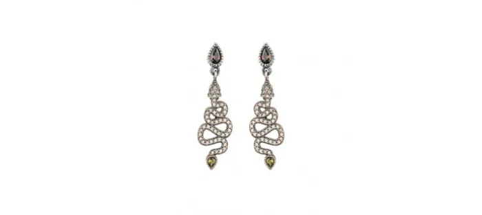 Pendientes de botón con una circonita pera de la que cuelga una serpiente repleta de circonitas y piedras semipreciosas.