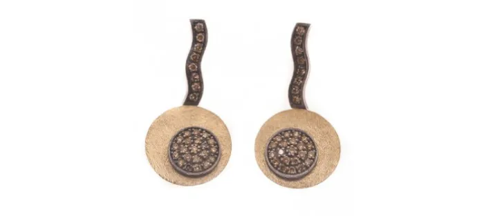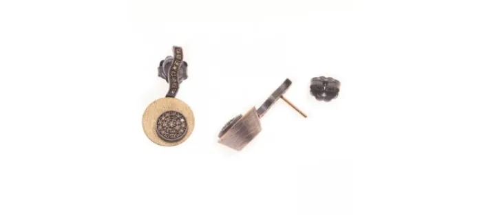 Pendiente de plata envejecida de primera ley (925) y oro amarillo de 18 Quilates. Perno también en oro amarillo de 18 Quilates.
